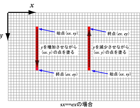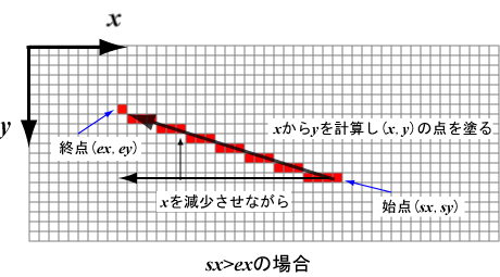 直線の始点の座標を (sx,sy)、終点の座標を(ex,ey)とします。 今回は以下の方針で直線を描くことにします。