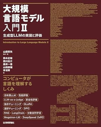 大規模言語モデル入門 II 〜生成型LLMの実装と評価〜 山田 育矢 (監修), 鈴木 正敏 (著), 西川壮介(著), 藤井一喜(著), 山田 康輔 (著), 李凌寒 (著) 出版社 : 技術評論社 (2024/9/4) ISBN-10 : 4297143933 ISBN-13 : 978-4297143930本の情報: Amazon Japan (Amazonの説明より抜粋) 「大規模言語モデル入門」の続編。本書では実装部分で扱い切れなかった話題を取り上げ、特に大規模言語モデルの評価と生成LLMに関連する解説を充実させる。「大規模言語モデル入門」の9章に続き、10章から始まる。 本の情報: 技術評論社 サポートページ(ソースコード、正誤表含む): github 個人メモ (nitta) |