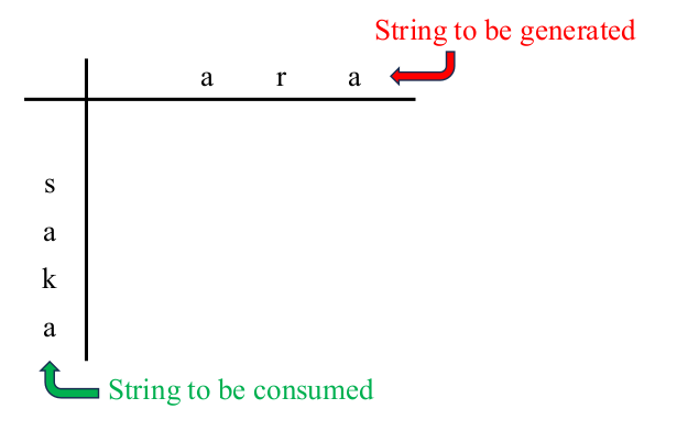 To solve with Dynamic Programming, we use a table with the original (to be consumed) string in the vertical direction and the target (to be generated) string in the horizontal direction. Leave a blank space at the beginning of each string.