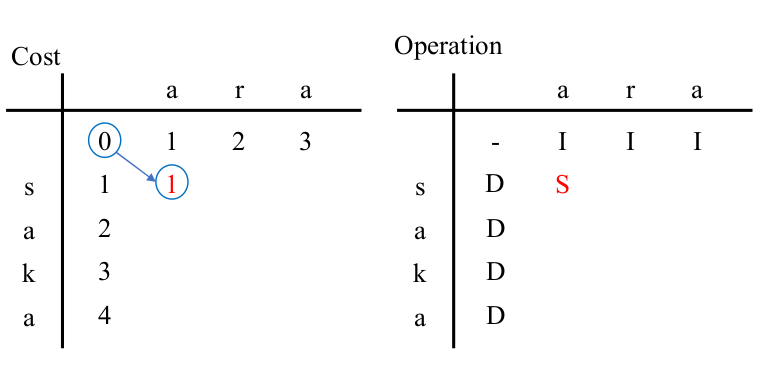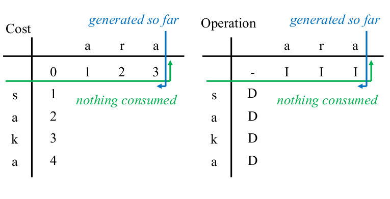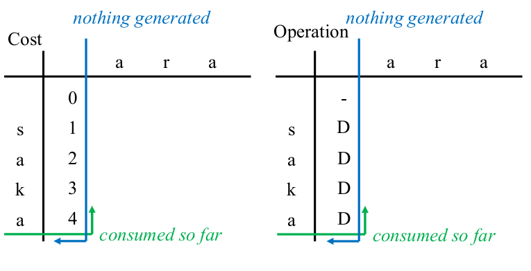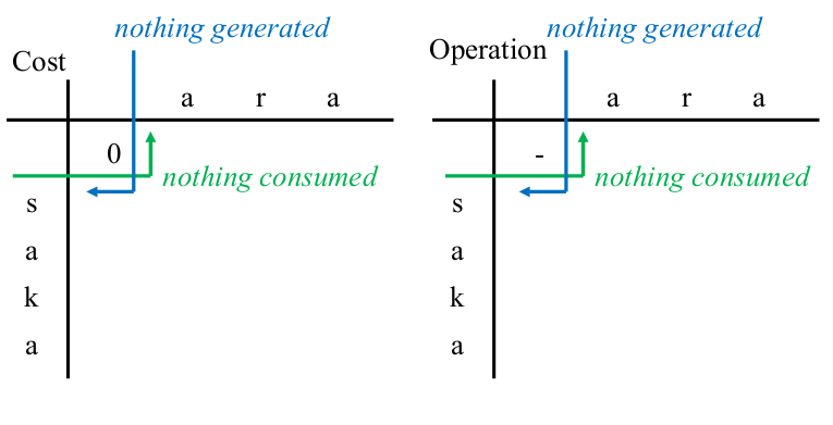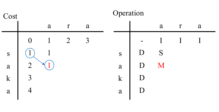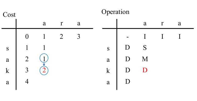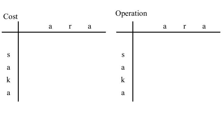 ![]() | Of the two tables, the left table records the minimum costs and the right table records the last operation performed. | ||||||||||||||||||