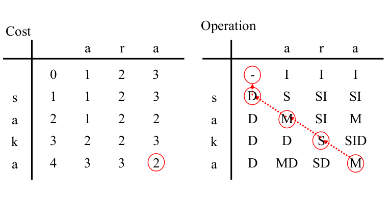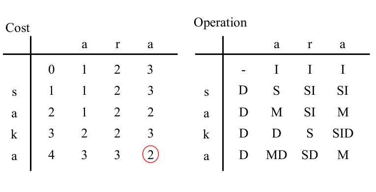 All the cell is filled. If multiple symbols are written together in the right table, it means that either operation has the lowest cost. For example, the symbol "SI" means "either SUBSTITUTE or INSERT is OK". You can see that the minimum cost is $2$ by looking at the bottom right cell of the left table ($4$, $3$). | ||||||||||||||||||