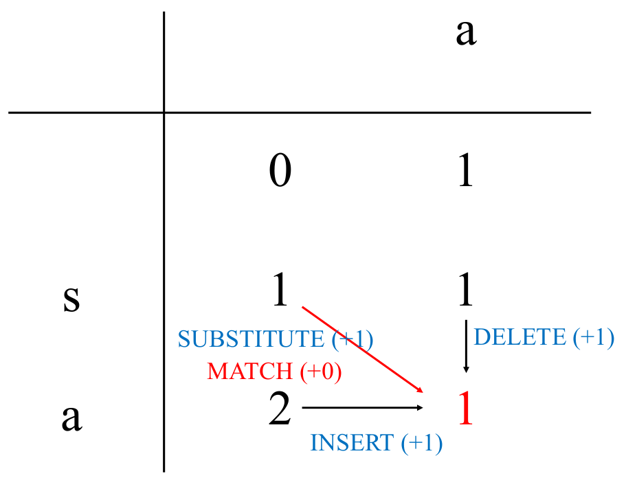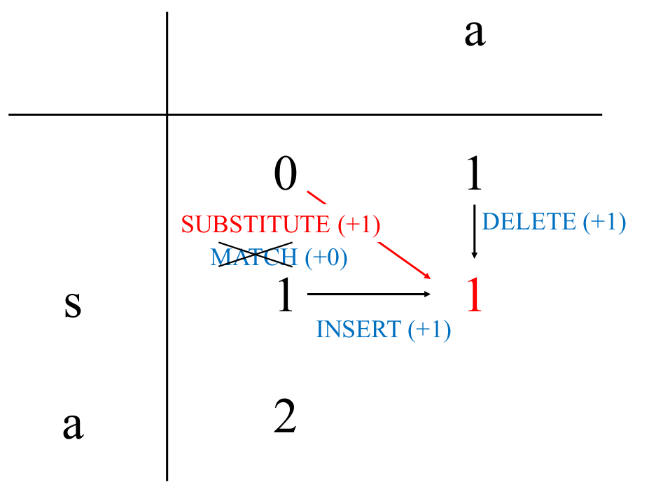 The state of ($2$, $1$) is "First, DELETE the leading 's' from the original string, then MOVE CURSOR through 'a' for the character of the orignal and the target is the same. The minimum cost of the operations is $1 \mbox{(DELETE cost)} + 0 \mbox{(MATCH cost)} = 1$. | ||||||||||||||||||