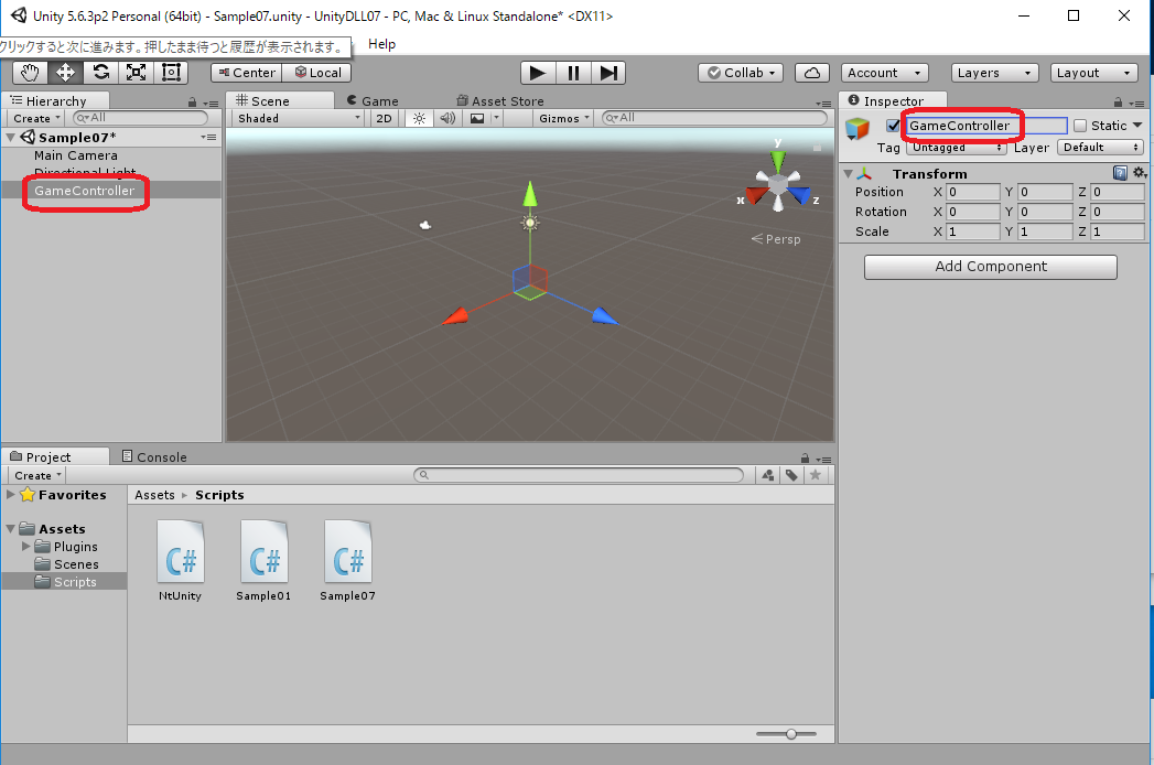 上部のメニューから「Assets」-> 「Create」 -> 「C# Script」 -> ファイル名は Sample07