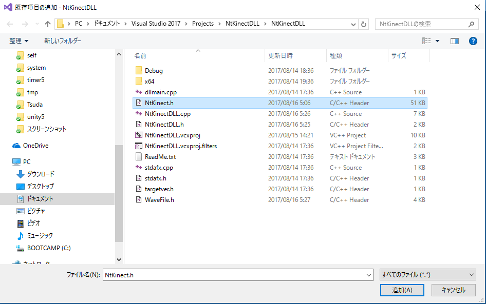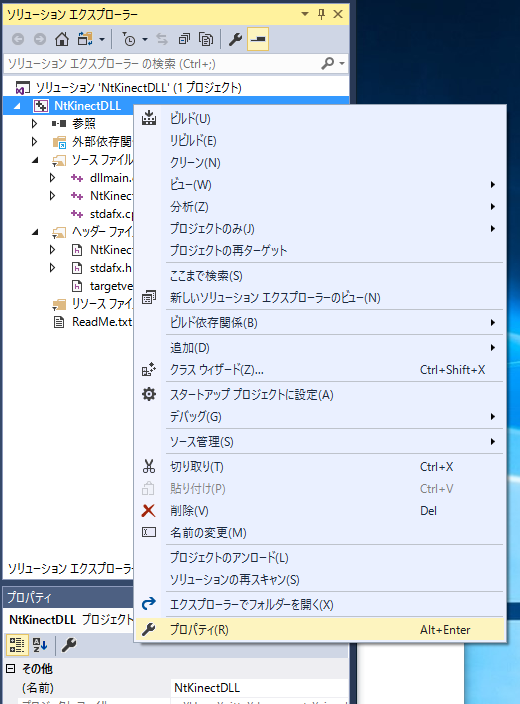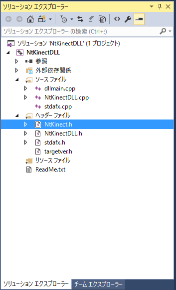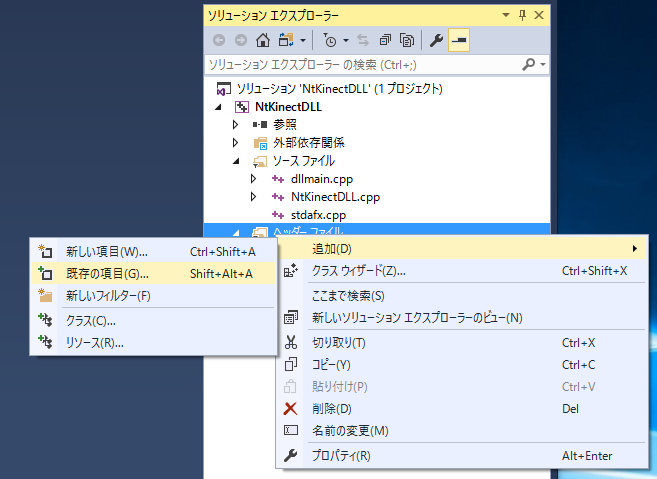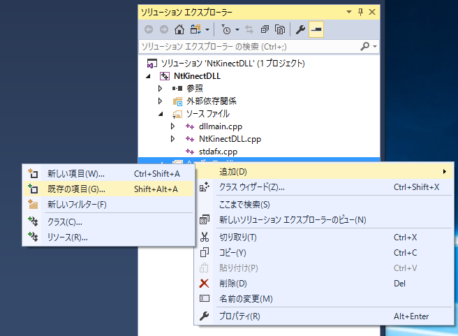 上記のリンクから NtKinect.h をダウンロードして下さい。 dllmain.cpp などプロジェクトのソースが置かれているフォルダ(この例だと NtKinectDLL/NtKinectDLL)に NtKinect.h を配置してから、 「ソリューションエクスプローラ」の「ヘッダーファイル」の上で右クリックで 「追加」 -> 「既存の項目」 -> NtKinect.h を選択します。