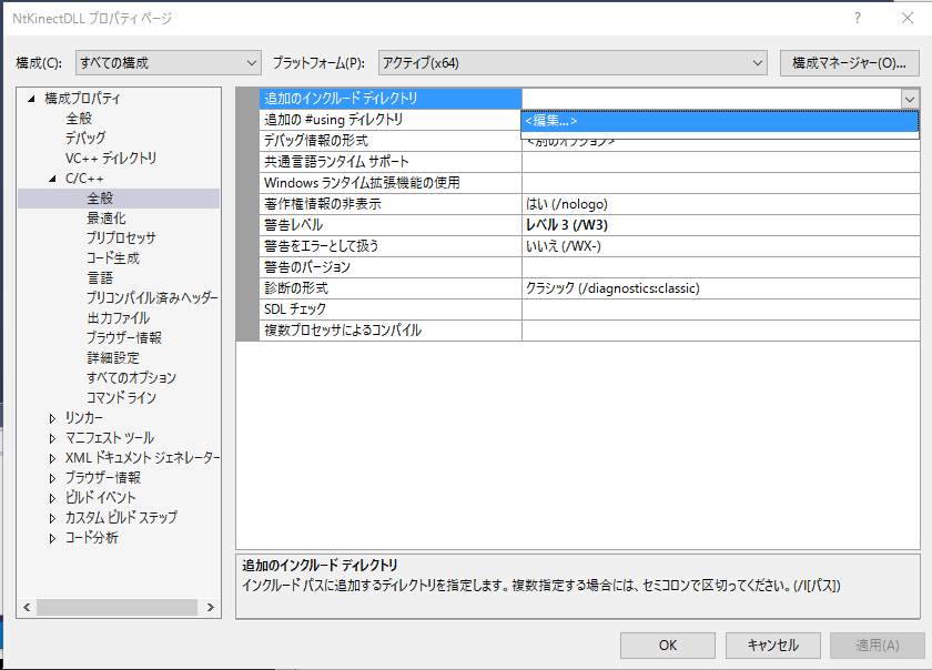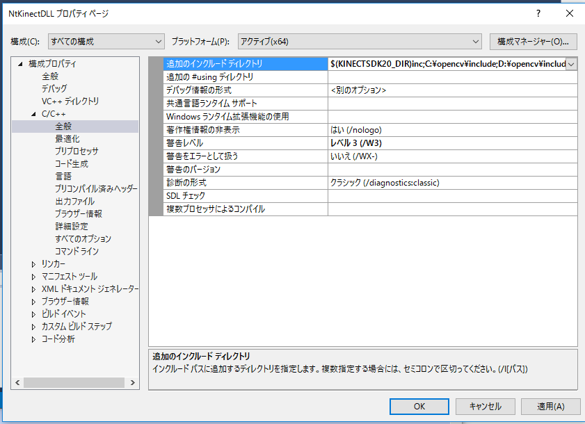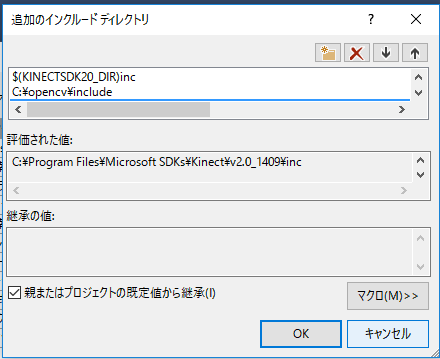 | インクルードファイルのパス | $(KINECTSDK20_DIR)inc | |