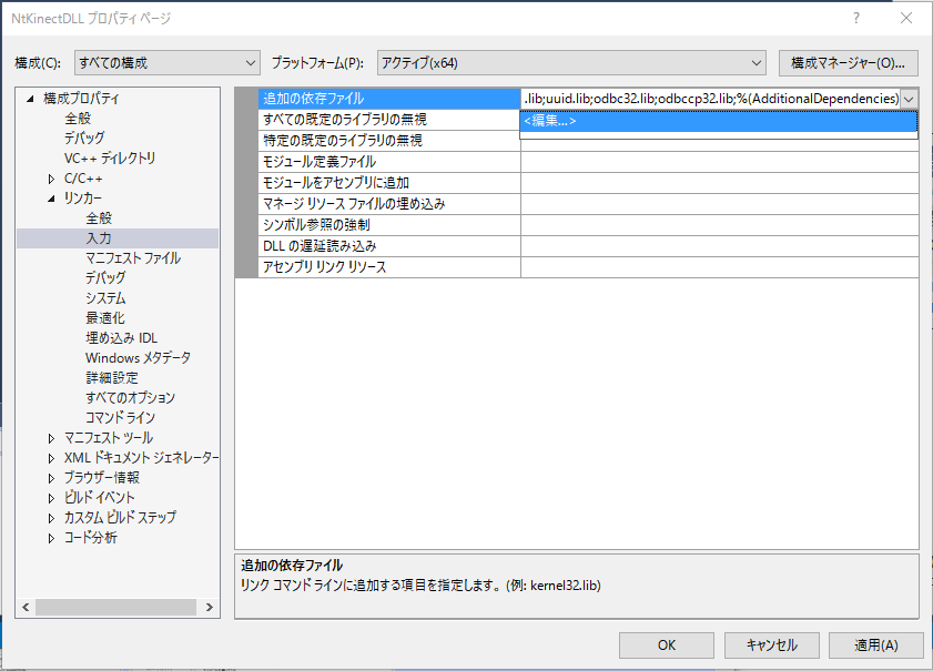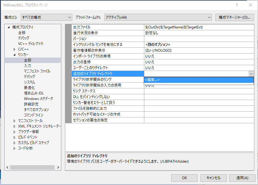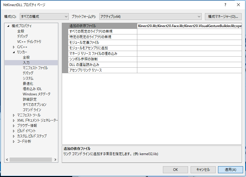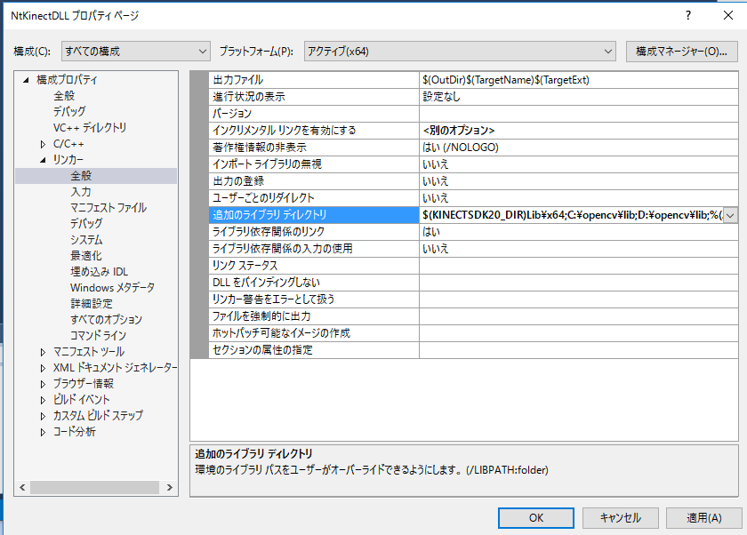 | ライブラリのパス | $(KINECTSDK20_DIR)Lib\x64 |
