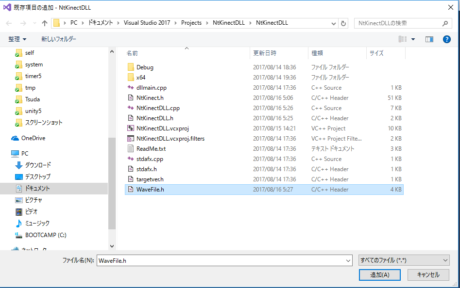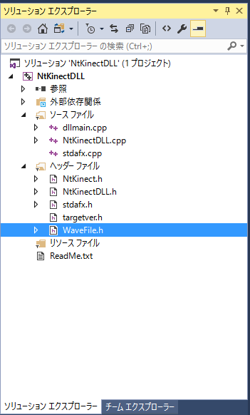 Microsoft が配布している AudioCaptureRaw-Console C++ Sample の WaveFile.h を少し変更したものをプロジェクトに加えます。 上記のリンクから WaveFile.h をダウンロードして下さい。 dllmain.cpp などプロジェクトのソースが置かれているフォルダ(この例だと NtKinectDLL/NtKinectDLL)に WaveFile.h を配置してから、 「ソリューションエクスプローラ」の「ヘッダーファイル」の上で右クリックで 「追加」 -> 「既存の項目」 -> WaveFile.h を選択します。