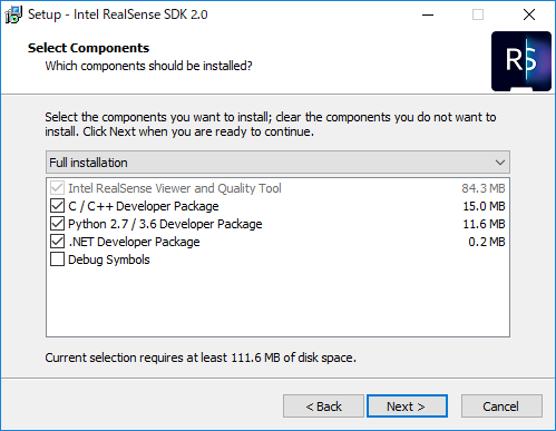 SDK 2.0 (Build 2.13.0) から Intel.RealSense.SDK.exeをダウンロードして実行する。[注意1]