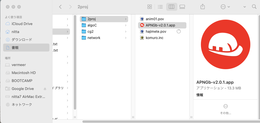 ここでは APNGb-v2.0.1.app を作業用フォルダ /Users/nitta/Documents/class.2022/2proj/ に移動したものとする。