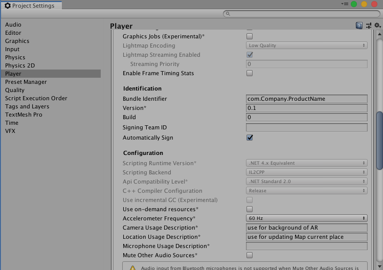 - Unityのメニューで File → Build Settigs... → Platform で iOS を選択 → Player Settings...