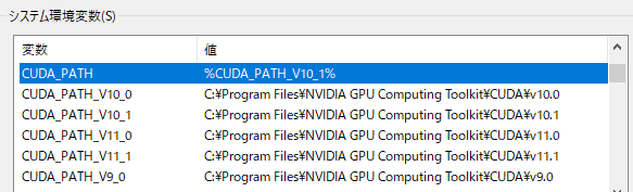 変数名: CUDA_PATH 値: C:\Program Files\NVIDIA GPU Computing Toolkit\CUDA\v10.1最近は自動で設定されるようだ。また、バージョンが付加された変数名の値も自動で設定されるようだ。
