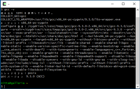 - cygwinを起動して "gcc -v" とタイプすると、表示される "ターゲット: x86_64-pc-cygwin"