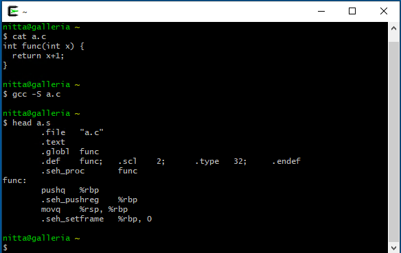 - 簡単なCの関数をファイル a.c の中に定義し、"-S" オプションをつけてgccでコンパイルしてアセンブリ言語を出力させてみる。