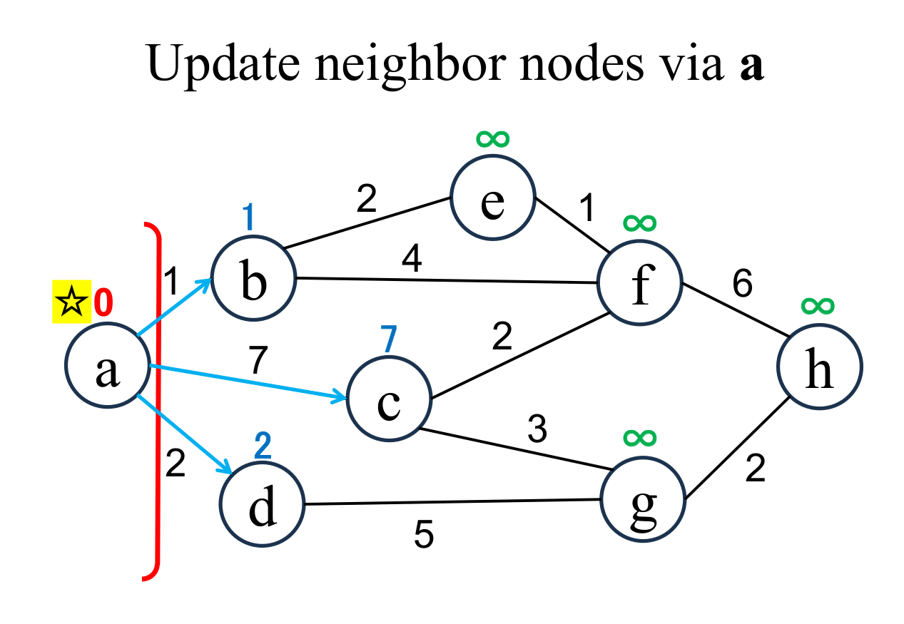 Calculate the distance of each node (b, c, d ), if and only if the node is "directly connected" from the most recently fixed node (a with ☆), and its "shortest distance" is "unfixed". If the result is less than current value, update it (b → 1, c → 7, d → 2). Edges that update the shortest distance of unfixed nodes across the boundary are expressed by light blue arrows. |