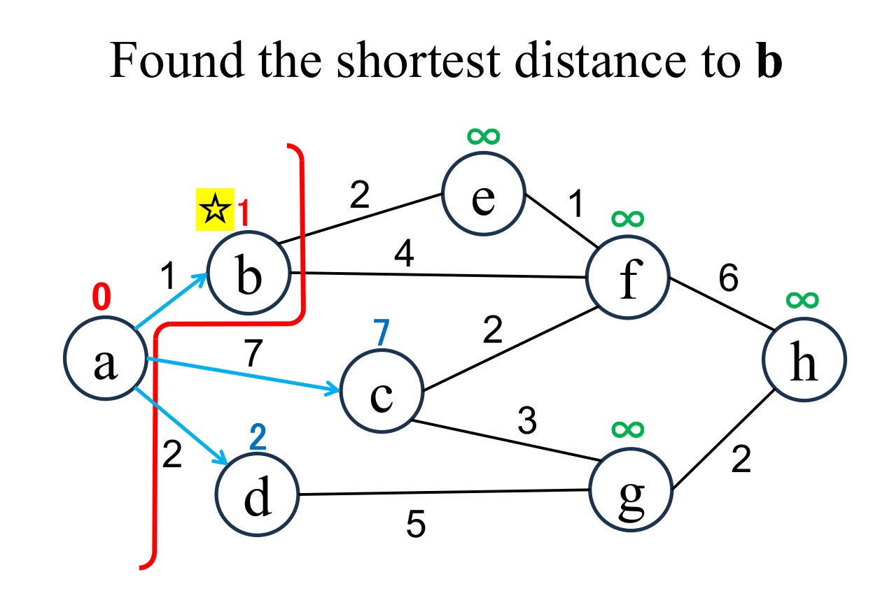 among the "unfixed" nodes. The shortest distance of the selected node (b marked with ☆) is "fixed" to the current value (1). If there are multiple nodes with the shortest distance value, it doesn't matter which one you choose. |