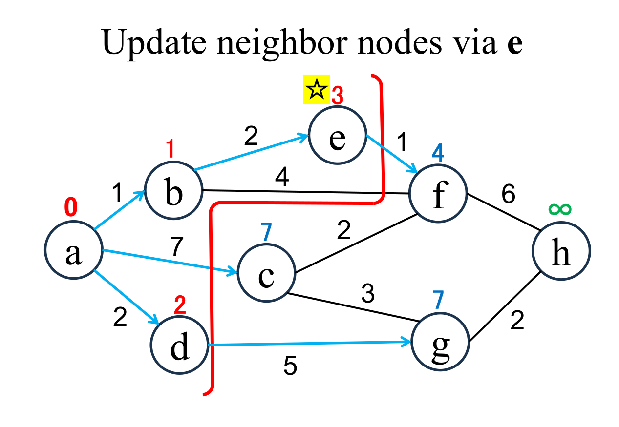 among the "unfixed" nodes. The shortest distance of the selected node (e marked with ☆) is "fixed" to the current value (3). |
