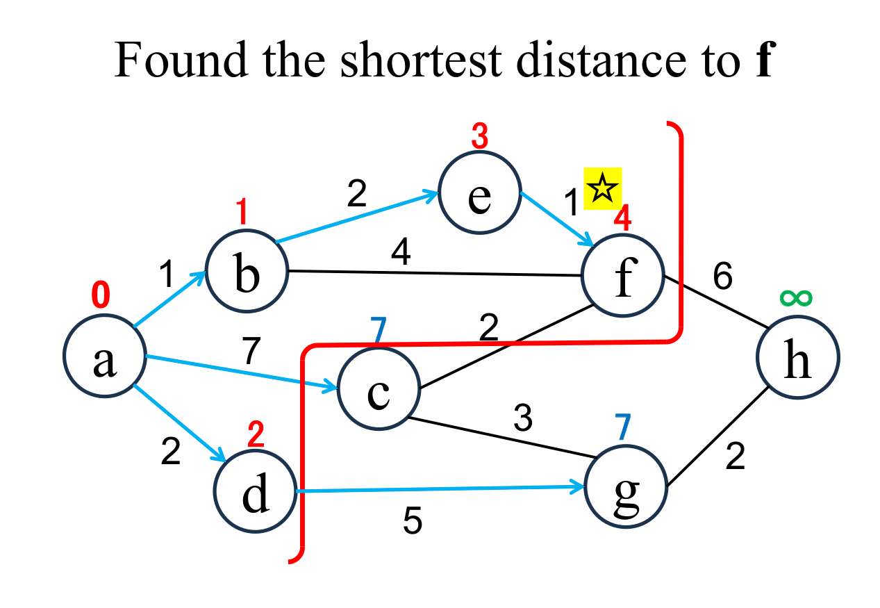 among the "unfixed" nodes. The shortest distance of the selected node (f marked with ☆) is "fixed" to the current value (4). |