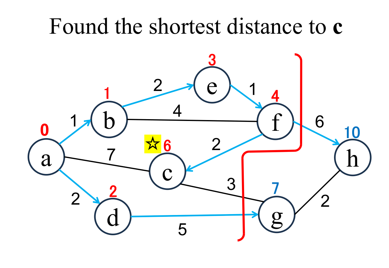 among the "unfixed" nodes. The shortest distance of the selected node (c marked with ☆) is "fixed" to the current value (6). |