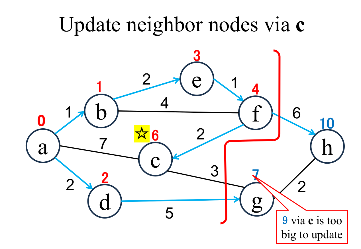 Calculate the distance of each node (c, h), if and only if the node is "directly connected" from the most recently fixed node (f with ☆), and its "shortest distance" is "unfixed". If the result is less than current value, update it (c → 6, h → 10). |