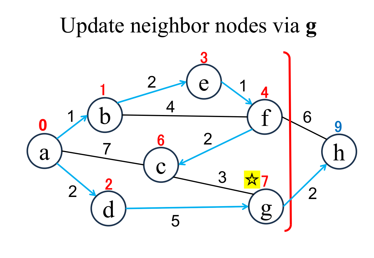 among the "unfixed" nodes. The shortest distance of the selected node (g marked with ☆) is "fixed" to the current value (7). |