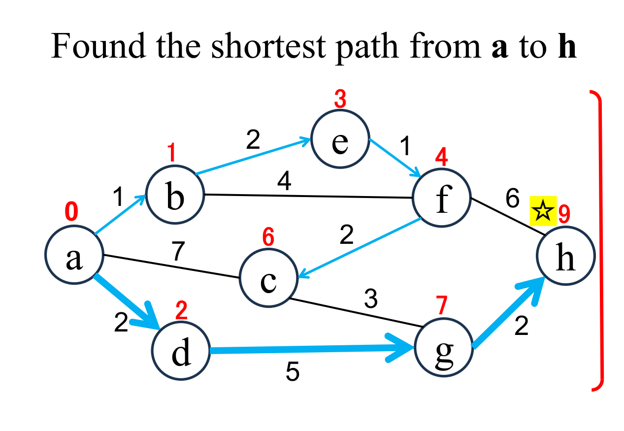 The shortest distance (9) from a to h and shortest path (a → d → g → h) are found. |
