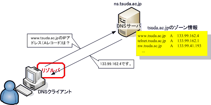 パソコンなどが、 「ホスト名からIPアドレスを調べるためにDNSサーバに質問を送り、 IPアドレスを知る」仕組みを「リゾルバ (resolver)」といいます。 クライアントは、個々のコンピュータ上で動作している リゾルバのおかげでDNSサーバと通信して、ホスト名からIPアドレスを 得ることができるのです。