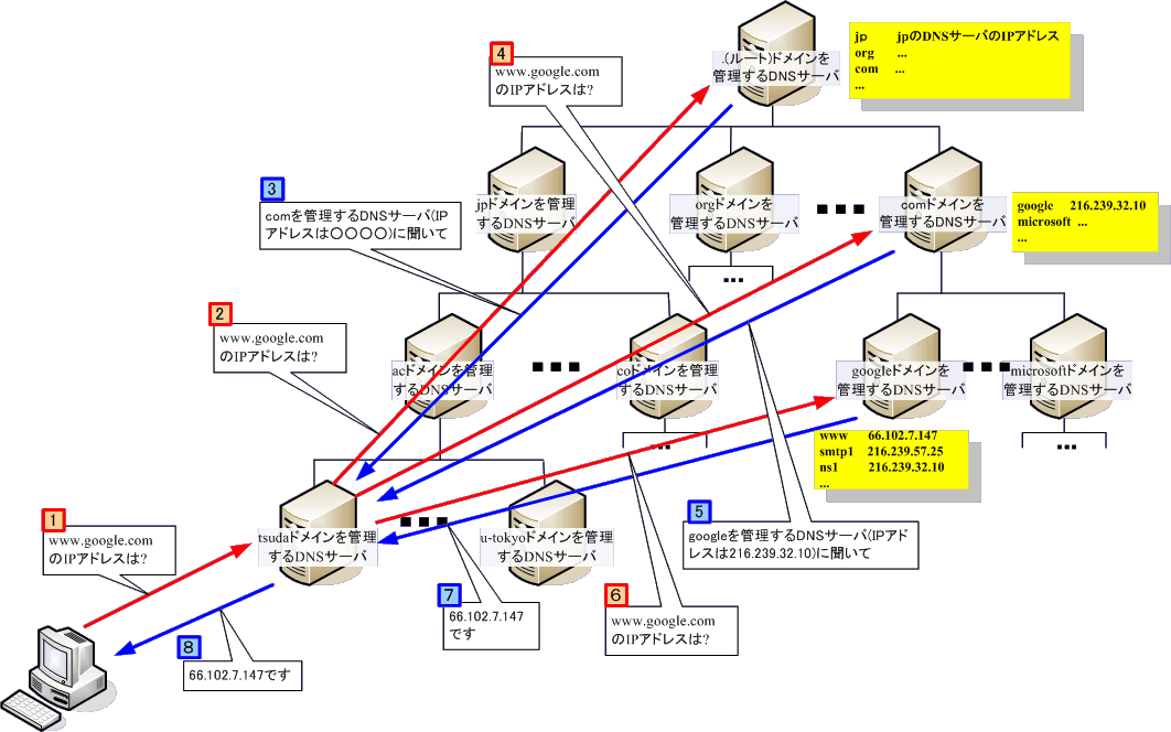 (上の図はDNSの動作する概念を表したものです。実際にはルートサーバは 第2層までの全データをキャッシュしているので google.com のDNSサーバの IPアドレスを直接返すことができます。)