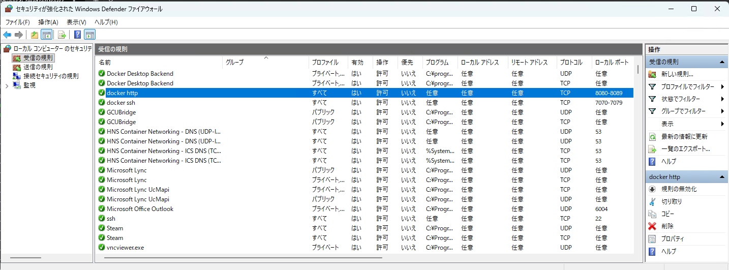 5. (ホストOS上) ファイアウォールの状態を確認する。