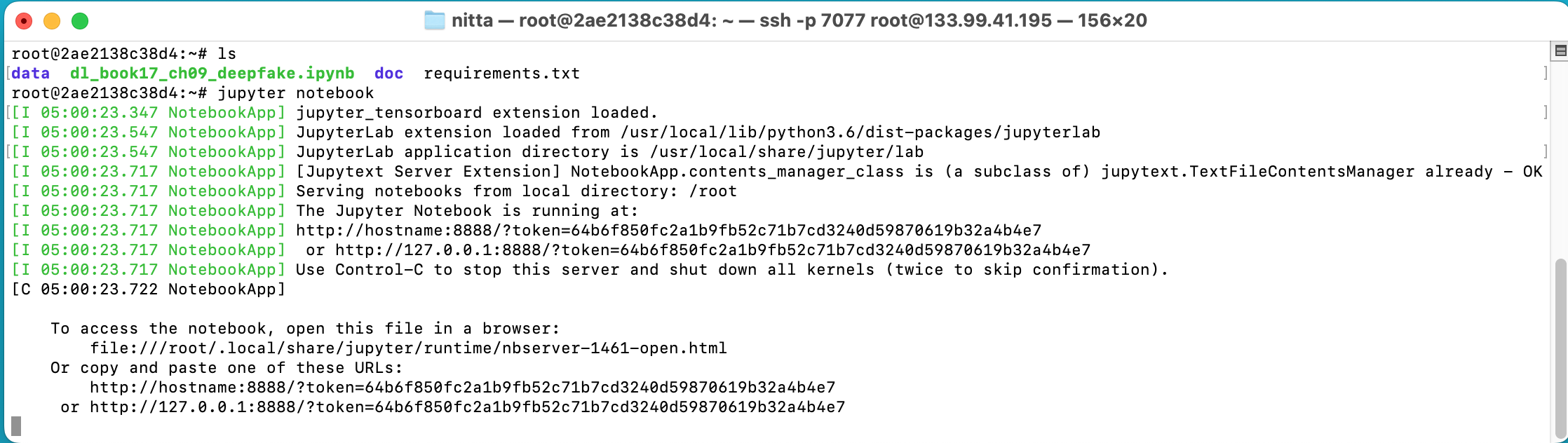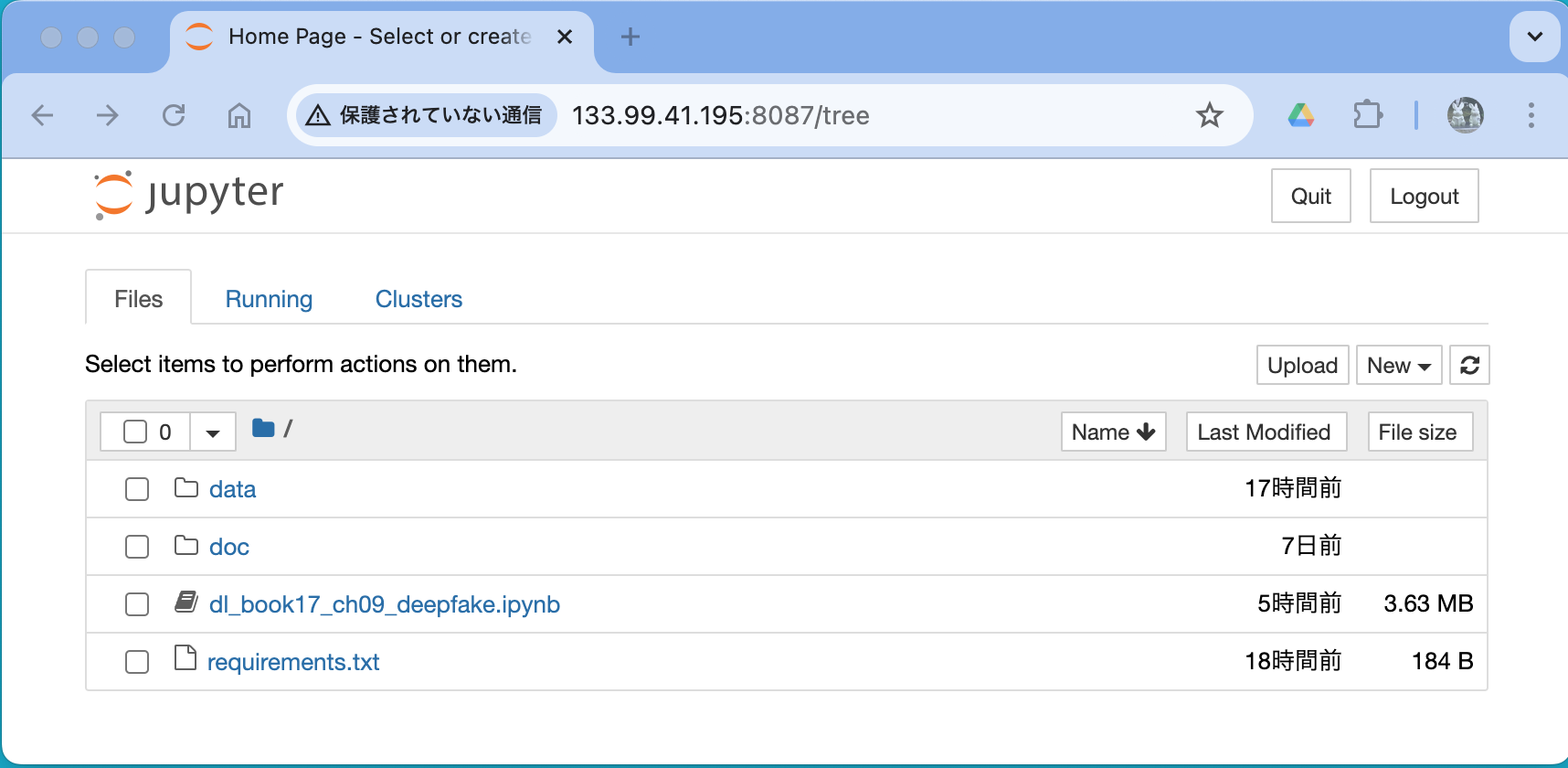 (例) jupyter が表示したURL: http://127.0.0.1:8888/?token=64b6f850fc2a1b9fb52c71b7cd3240d59870619b32a4b4e7 (変更点) IPアドレス: 127.0.0.1 (または localhost) → 133.99.41.195 ポート番号: 8888 → 8087 (アクセスするURL) http://133.99.41.195:8087/?token=64b6f850fc2a1b9fb52c71b7cd3240d59870619b32a4b4e7