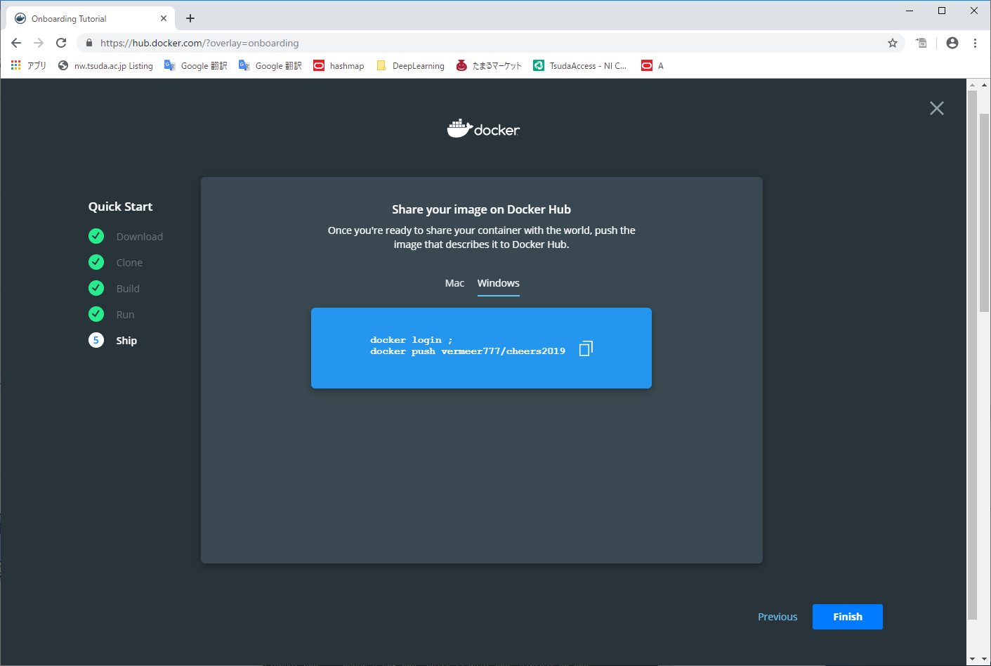 スタート → Docker Desktop → docker id と password を入力する