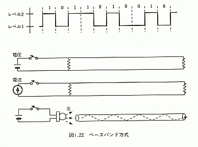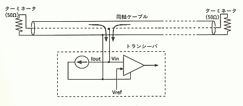 トランシーバは同軸ケーブルを電流源信号によって駆動していて、 論理値 0 または 1 がそれぞれ電流を 「流さない」または 「流す」 ことを表しています。 1台のトランシーバは約40mAの電流を流し (シールドを基準点にして同軸ケーブルの中心導体からトランシーバ へと負の電流が流れる)、同軸ケーブルの中心導体とシールドの電位差は 約2Vになります。
