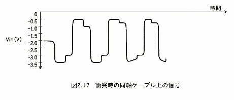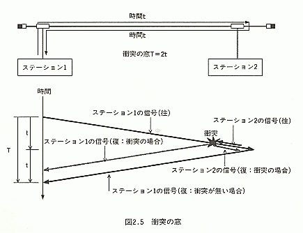 各ノードはチャネル上のトラフィックを検出している (「話す前に聞く(listen-before-talking)」) わけです。 チャネル上に既にトラフィックがあれば送信を控えます、 トラフィックが無いことを確認してから通信を始めても、 信号の伝播 (同軸ケーブル上の信号伝播速度は約0.77c) には時間がかかる (propagation delay) ので、通信中に 信号の衝突が起きる可能性は残っています。