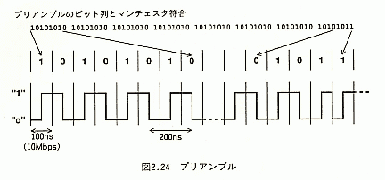 物理的に信号立ち上がり時は不安定なので、データを送出する前に チャネルを安定し同期をとる仕事が必要になります。 送信側はデータ送出に先だって 8 octet のプリアンブルを送り出し ます。 受信側はプリアンブルの最後 2bit に1が連続することを利用して データの先頭を検出します。