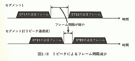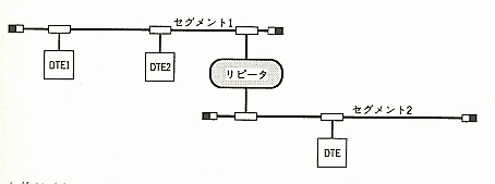 リピータは、接続された2つのセグメントに対して双方向の増幅・ リタイミング機能を果たします。 片側のセグメント上のプリアンブルを含むデータ・フレームを そのまま忠実に反対側セグメントに送出します。 リピータ内部では一旦マンチェスタ符合がデコードされ再び エンコードされて反対側に送出されます。 ただし、プリアンブル部はリピータが生成します。