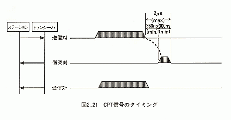 トランシーバはホストからの送信対信号を watchdog timer で監視し、 150 μsec を越えた連続信号が送られてくるとこれを物理チャネルに 送出しません。 (Ethernetが正常に機能する鍵である)信号衝突機構が機能している ことを確認するために、ホストが送信を完了した直後の 9.6 μsec を 使って、トランシーバと送信ホストの間で衝突検出回路の動作確認を 行ないます。
