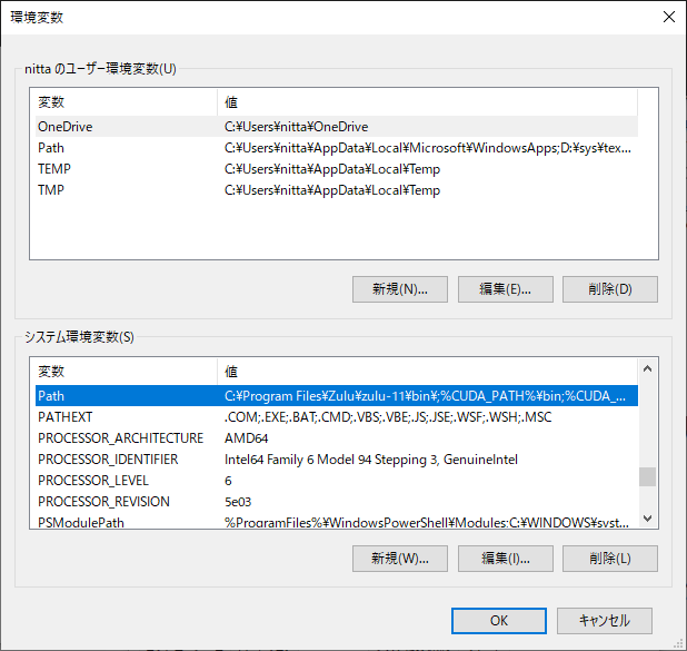 5. インストール時にjavaバイナリへのパス (Path) は自動的に設定される。 環境変数の一覧を見ると、環境変数 Path の先頭に Azul Zule java のパス が含まれていることを確認できる。