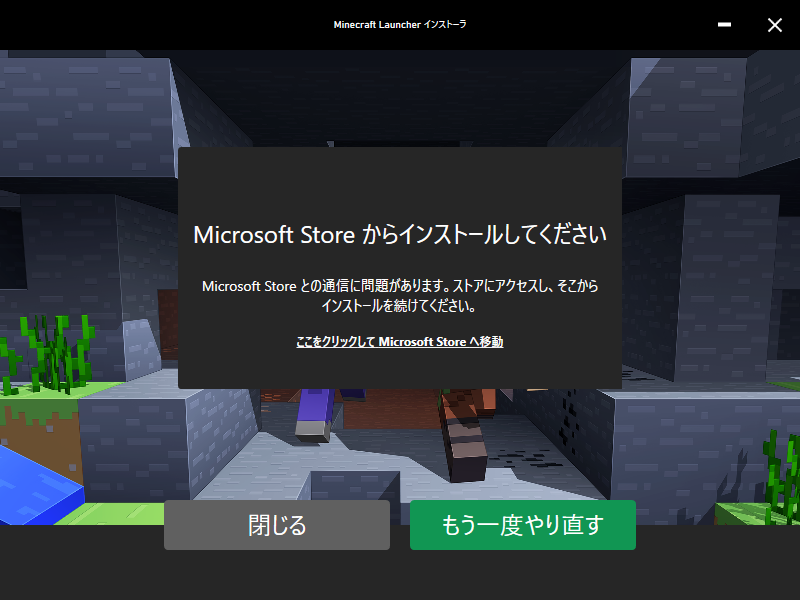 - 「Microsoft Store との通信に問題がある」というエラーとなった。「もう一度やり直す」を選択した