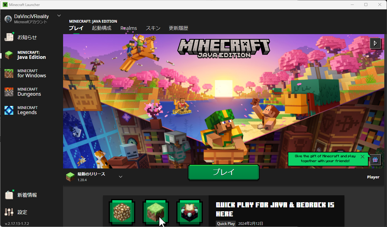 - Minecraft が起動するので、「プレイ」を選択する。
