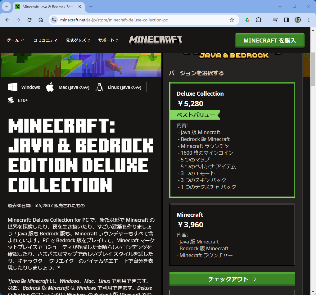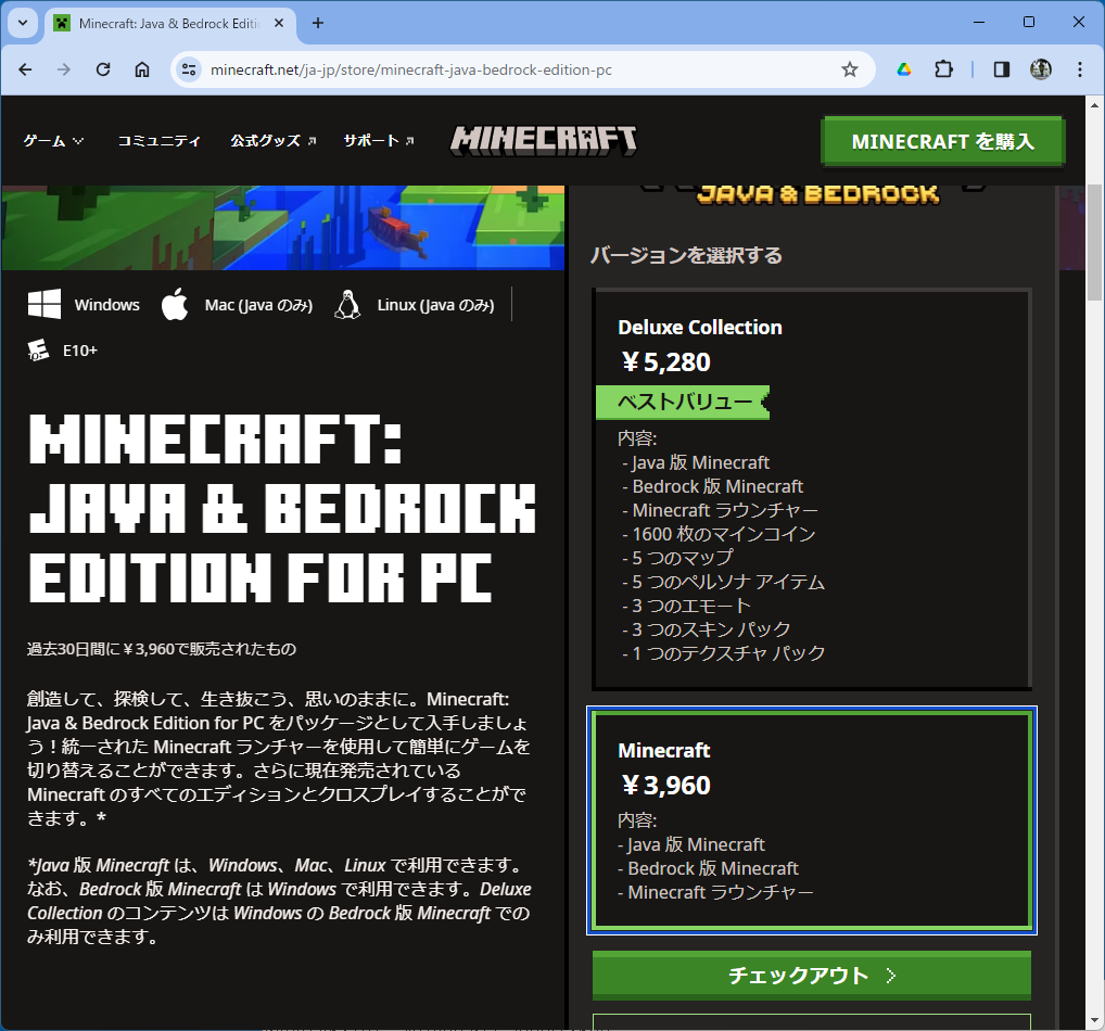 - 通常版 (Deluxe Collection ではない方) を選択して「チェックアウト」をクリックする。