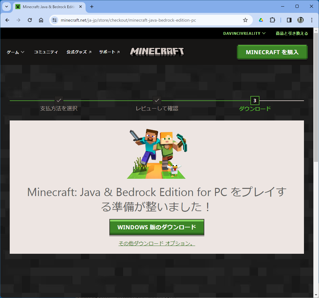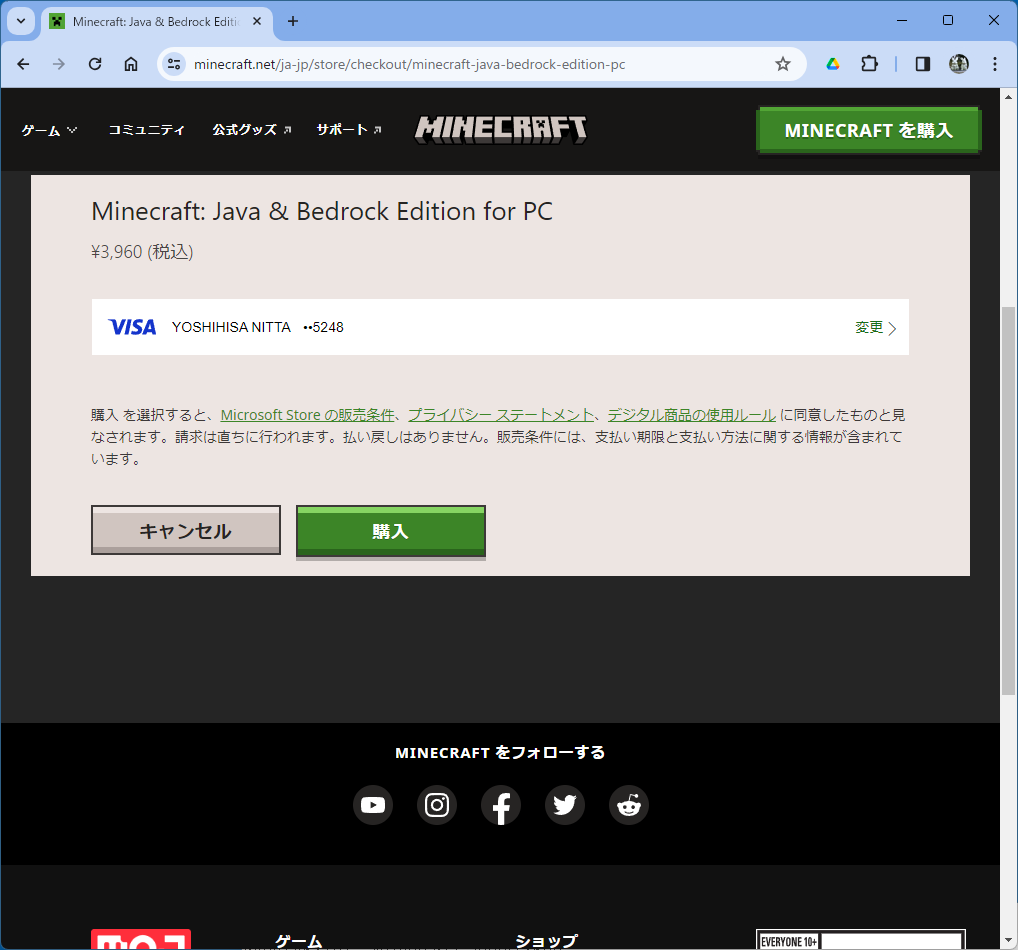- 「MINECRAFT を購入」をクリックして購入画面に移動する。