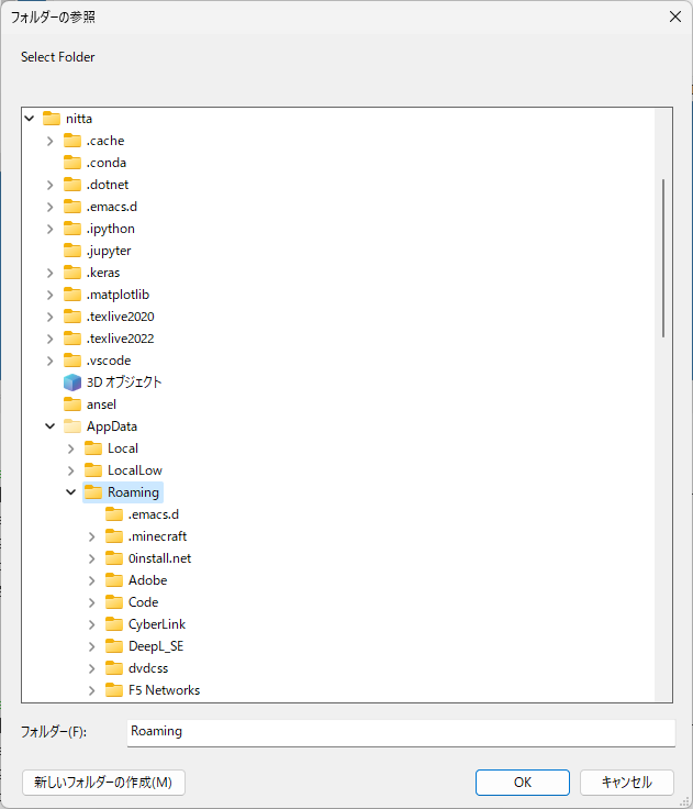 - 「フォルダの参照」で、"Roaming" を選択して、「新しいフォルダーの作成」をクリックする。。