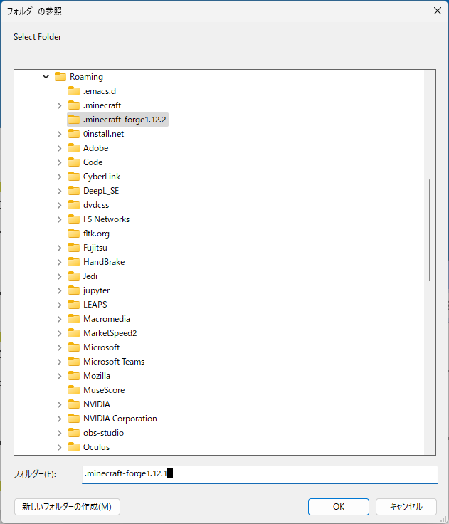 - 新しいフォルダが作成されるので、フォルダ名を ".minecraft-forge1.12.2" に変更して "OK" をクリックする。