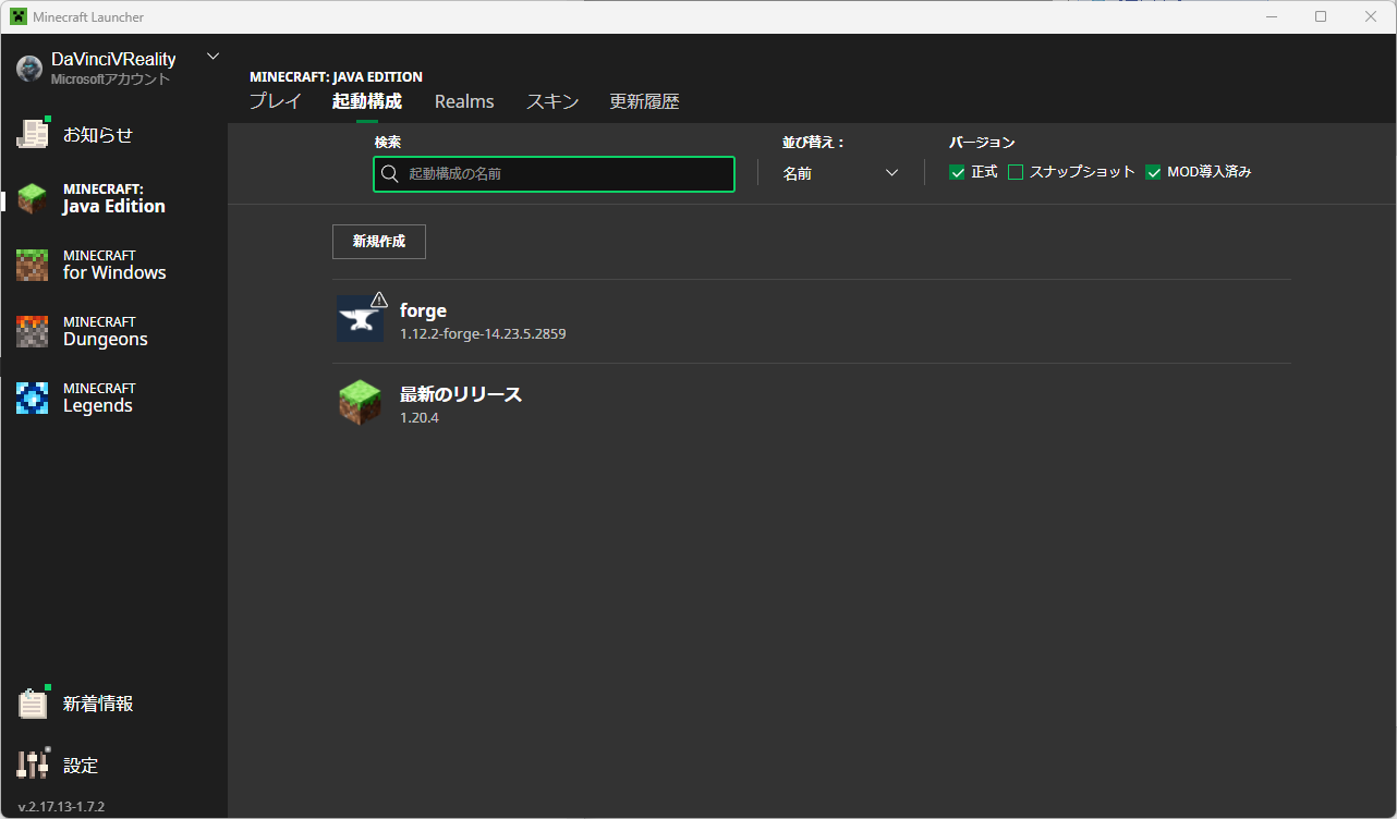 - 「起動構成」を選択すると、先ほどインストールした "forge" という項目があるので "..." から「編集」を選択する。
