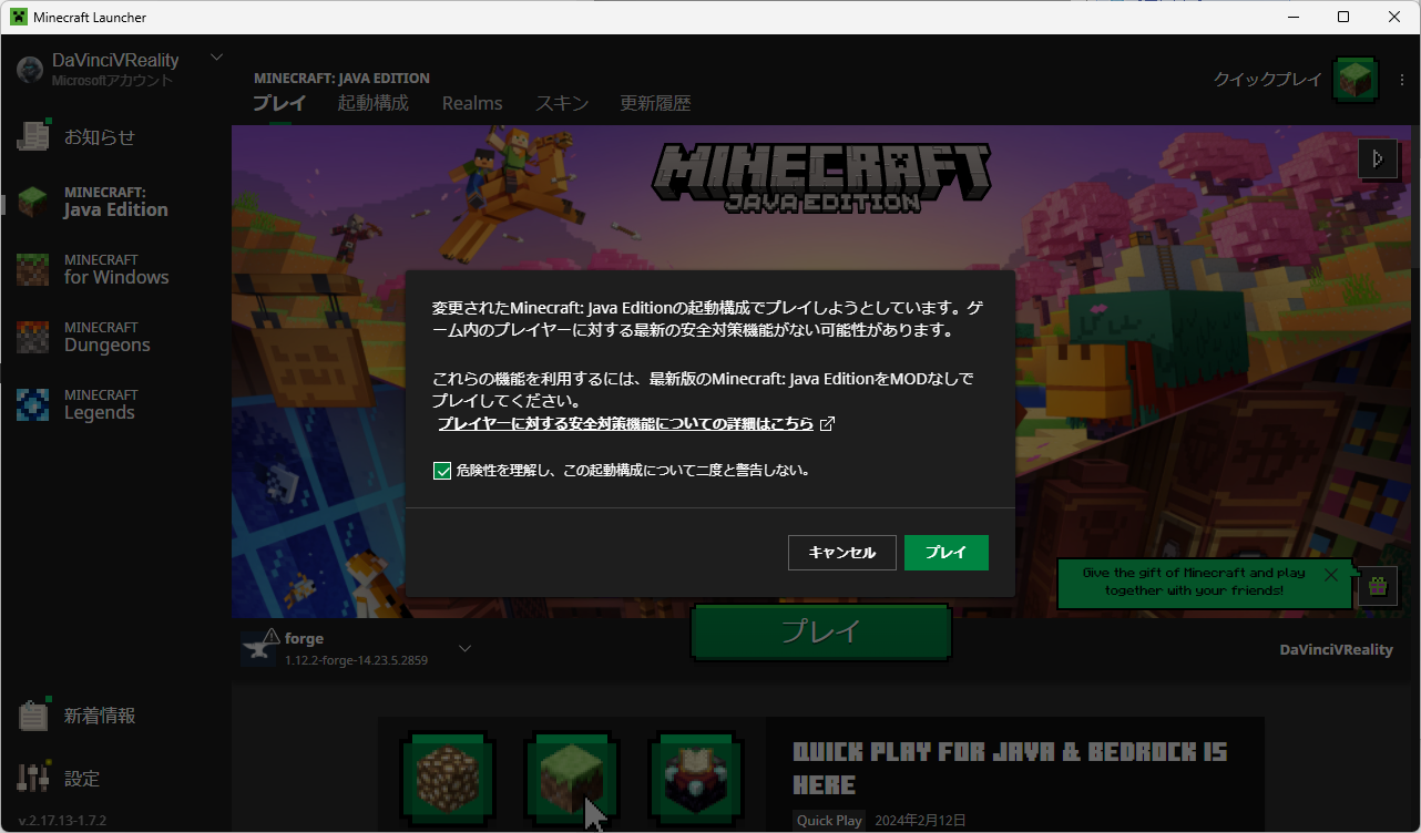 - 警告が表示されるので、「危険性を理解し、この起動構成について二度と警告しない」をチェックして、「プレイ」を起動する。
