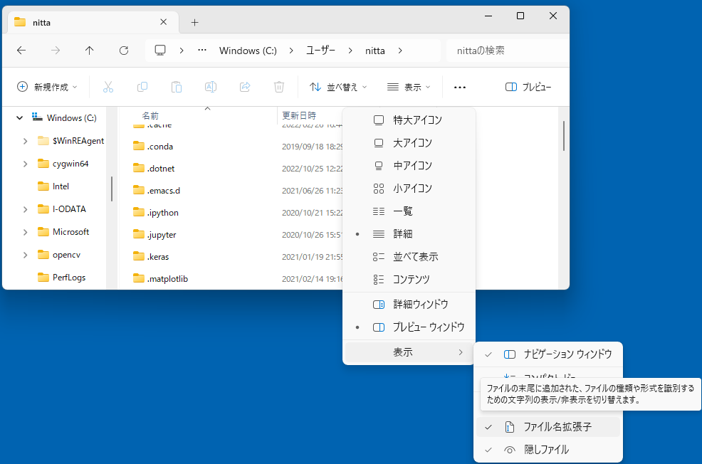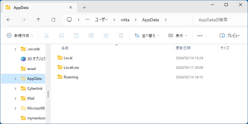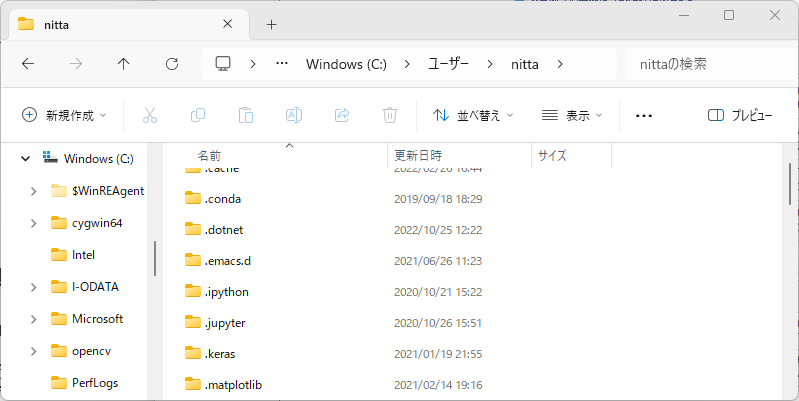 - エクスプローラーで、ホーム "C:\Users\ユーザ名" へ移動する。