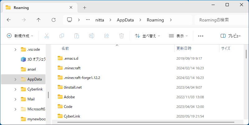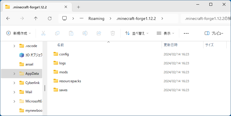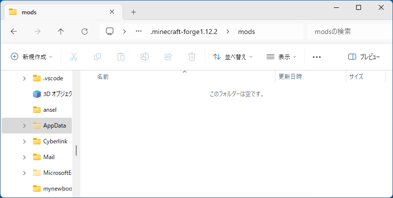 - "AppData" フォルダ → "Roaming" フォルダ → ".minecraft-forge1.12.2" フォルダ → "mods" フォルダを順に選択する。