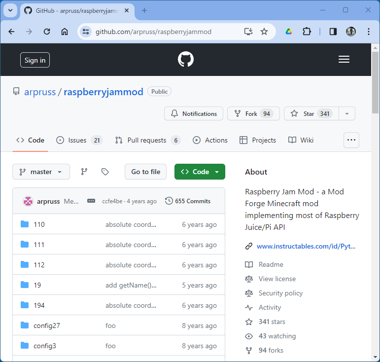 - Raspberry Jam Mode の github ページにアクセスする。