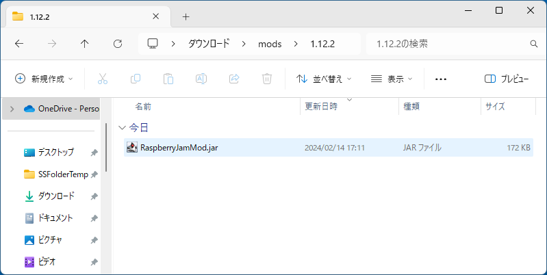 - "1.12.2" フォルダの中の RaspberryJamMode.jar を、エクスプローラーで先ほど開きっぱなしにしてあった "mods" フォルダにコピーする。