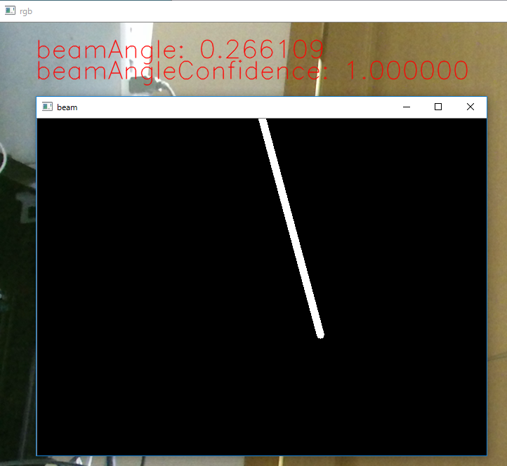ウィンドウの左上に、音声の方向とその信頼度が表示されます。 また、別ウィンドウ beam に音声方向が線で表示されます。