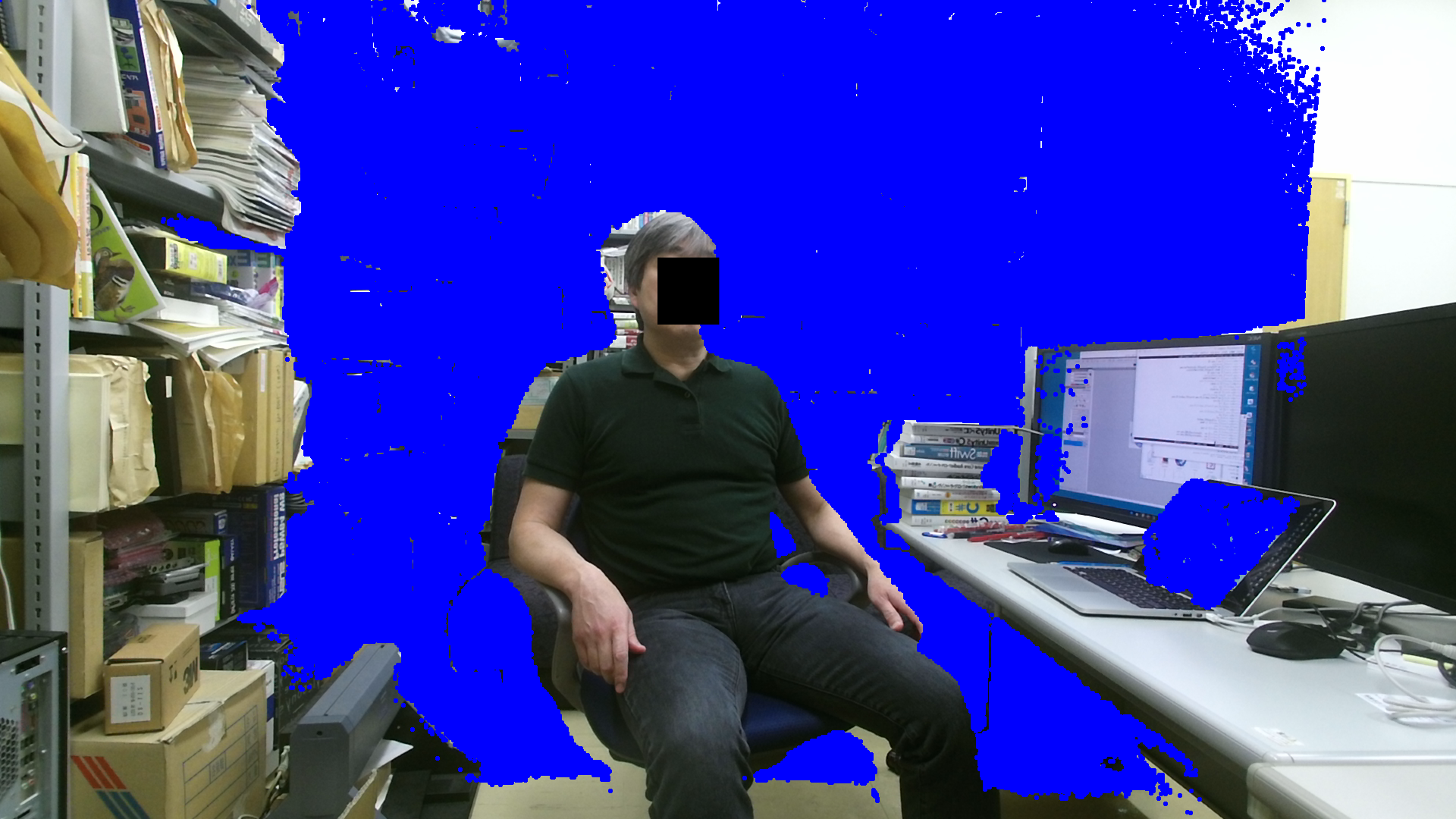 2000mm よりも遠い画素を青で塗ることで、近くのものの映像だけを表示します。 500mmよりも小さい値は測定できていないだけなので、その画素は 8000mm 以遠として扱っています。